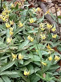 Erythronium umbilicatum is a spring ephemeral and its preferred habitat is forests. It has egg-shaped bulbs up to 25 cm long. Leaves are up to 20 cm long, mottled. Scape is up to 20 cm long, bearing one yellow flower, sometimes with brown spots on the tepals.[2][3]