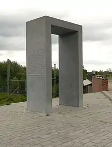 The official memorial was opened on 11 May 2001 in the presence of 400 relatives as well as many dignitaries, rescuers and citizens from Eschede.[6] The memorial consists of 101 wild cherry trees each representing one fatality. The trees have been planted along the rails near the bridge and with the switch in front. From the field, a staircase leads up to the street and a gate; on the other side of the street a number of stairs lead further up to nowhere.[7] There is an inscription on the side of the stone gate and an inscription on a memorial wall that also lists the names of the fatalities placed at the centre of the trees.