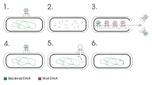 The CC31 is capable of integrating its genetic material with the host's. This stage, known as the lysogenic cycle, halts particle formation, and allows for the virus's genetic material to amplify across many subsequent bacterium generations.[12] The integration of the viral DNA happens non-homologously, forming bubbles of single stranded DNA. As DNA replication, crossing over, and cellular division occurs, the viral DNA is reshuffled with cellular DNA. This results in horizontal gene transfer between the virus and cell, resulting in the evolution of the virus and the bacterium. The viral DNA also develops minute deletions, immunity regions, and silent genetic regions due to the non-homologous binding of the DNA. These change in virus' genetic material can either inhibit or promote future replication.[13]