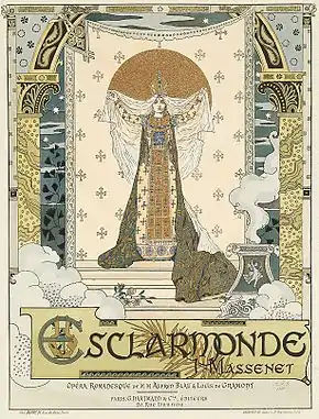 Esclarmonde (French pronunciation: [ɛsklaʁmɔ̃d]) is an opéra (French: opéra romanesque) in four acts and eight tableaux, with prologue and epilogue, by Jules Massenet, to a French libretto by Alfred Blau and Louis Ferdinand de Gramont. It was first performed on 15 May 1889 by the Opéra-Comique at the Théâtre Lyrique on the Place du Châtelet in Paris.