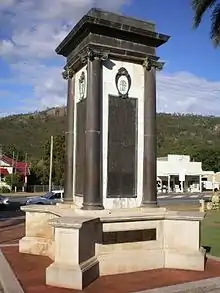 On 30 November 1920, Dr Graham Butler laid the foundation stone of the Esk War Memorial.[15] The finished memorial was unveiled by General Lachlan Chisholm Wilson on 27 August 1921.[16] The memorial records the names of 462 Shire residents who enlisted during the First World War. It also contains bronze honour rolls bearing the names of 83 local men who died during the war. Four commemorative plaques have subsequently been added to the structure. The war memorial stands in Esk Memorial Park, which also contains a memorial to Captain Logan, who was murdered while exploring the Brisbane Valley in 1830.[17][18]