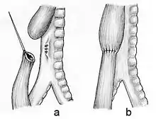 In a minority of cases, the gap between upper and lower esophageal segments may be too long to bridge. In these situations traditional surgical approaches include gastrostomy followed by gastric pull-up, colonic transposition and jejunum transposition.[7] Gastric pull-up has been the preferred approach at many specialized centers, including Great Ormond Street (London) and Mott Children's Hospital (Ann Arbor).[8] Gastrostomy, or G-tube, allows for tube feedings into the stomach through the abdominal wall. Often a cervical esophagostomy will also be done, to allow the saliva which is swallowed to drain out a hole in the neck. Months or years later, the esophagus may be repaired, sometimes by using a segment of bowel brought up into the chest, interposing between the upper and lower segments of esophagus.