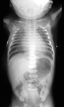 Esophageal atresia is a congenital medical condition (birth defect) that affects the alimentary tract. It causes the esophagus to end in a blind-ended pouch rather than connecting normally to the stomach. It comprises a variety of congenital anatomic defects that are caused by an abnormal embryological development of the esophagus. It is characterized anatomically by a congenital obstruction of the esophagus with interruption of the continuity of the esophageal wall.