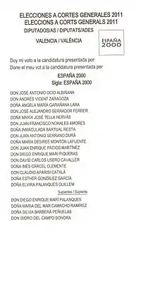 In the 2011 municipal elections, España 2000 won five council seats.[33] A councillor in Onda with 649 votes (5.05%), one in Dos Aguas with 66 votes (12.43%), two in Silla (Valencia) with 997 votes (9.56%) and one in Alcalá de Henares with 4,541 votes (5.18%).