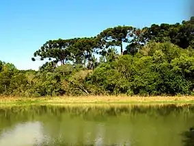 The park preserves a large remnant of Araucaria forest (mixed rainforest) and smaller remnants of the Upper Uruguay Forest (seasonal deciduous forest).[4] Flora includes araucaria forest, as well as species such as cedar, camboatá, laurel, cinnamon, bracatinga, angico, guajuvira, cabreúva, grápia, timbaúva and timbó.[3] Some of the plants in the park are centuries old. The shade-growing xaxin (Dicksonia sellowiana), which is threatened with extinction, can take up to 100 years to reach a height of 1 metre (3 ft 3 in). The most conspicuous trees are the araucarias, which once covered 25% of the state but have been reduced to 1%. One of the araucarias is over 40 metres (130 ft) tall and is estimated from the width of its trunk to be more than 300 years old.[7]