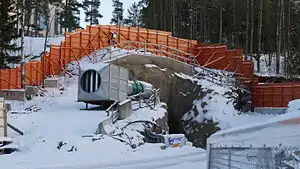 Espoonlahti (Finnish) or Esboviken (Swedish) is an under-construction underground station[1] to be built on the western metro extension (Länsimetro) of the Helsinki Metro in Finland. The station is located on the southwestern side of the shopping center Lippulaiva, near Espoonlahtivalahti, between Espoonlahti and Solmutori. In the March 2018 issue of Länsimetro, Kivenlahti was intended to be handed over to HKL during 2023.