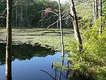 The Estabrook Woods is a wild tract of more than 1,200 acres (4.9 km2) of woodland, hills, ledge, and swamp two miles (3 km) north of the Town of Concord.[1] It is the largest contiguous and undeveloped woodland within thirty miles of Boston.[2] However, the woods have a history of human disturbance dating back to the Algonquian Native Americans who used controlled burning to clear tracts of land.[3] Later, colonists cleared much of Estabrook for agriculture and pastures, although vegetation has since rejuvenated.[3] The Woods are named for the Estabrook family, prominent in the area since colonial times.[4] The first Estabrook in the area, Capt. Joseph, purchased his farm, now part of Estabrook Woods, from the Pelham family, then of Rhode Island.[5]