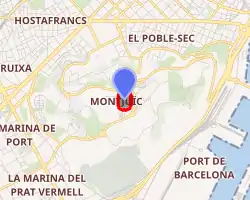 The stadium is located in the Anella Olímpica, in Montjuïc, a large hill to the southwest of the city which overlooks the harbor.