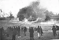 GEBA also hosted all games of the first edition of Copa América, held in Buenos Aires in 1916.[14] The final between Argentina and Uruguay was attended by more than 40,000 spectators that largely exceeded the capacity of the venue, calculated in 10,000. Because of that, the match had to be suspended. In disagreement with the decision, the angry crowd set fire to the stadium. The match had to be reprogrammed for the next day in the Racing Club stadium. The arson caused a large inactivity for the venue, which would not be reopened until 1918. The club did not rebuilt the fired grandstands, replacing them with a running track[5]