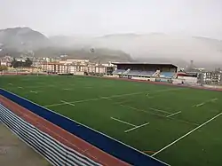 Built in 1972[5] and renovated in 2007, its playing surface is artificial grass[6] and the covered grandstand has 430 seats. The athletics track is homologated for every official competition.