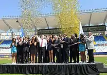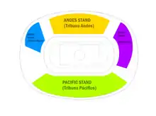 On March 20, 2013, a private inauguration ceremony was held. Former-president Sebastián Piñera cut the tape as part of the protocol.[57] The public ceremony began with a performance of the city's philharmonic orchestra, followed by a match between CDA and América de Cali. The musical group Garras de Amor performed prior to the party of Colo-Colo and Universidad Católica.[13] There was public criticism for the high price of the tickets to the opening party, and a group of councilors argued that the inaugurations of public places should be free as special moments for the city.[58] The inauguration was concluded by the percussion of the team of América de Cali, which was delayed in arriving to the city.[59]