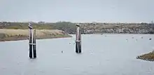 The Laguna Madre Estuary is located along the southern coast of Texas in Nueces, Kenedy, Kleberg, Willacy, and Cameron Counties, extending almost to the border with Mexico.[5] It is a long, shallow lagoon with no major river sources, separated from the Gulf of Mexico by Padre Island and Brazos Island and connecting with it through the Port Mansfield Channel and Brazos-Santiago Pass. Laguna Madre is the second largest of the Texas estuaries, approximately 130 miles (210 km) long and 4 to 6 miles (6 to 10 km) wide, with a surface area of 280,910 acres (113,680 ha) including Laguna Madre and its westward extensions in Baffin Bay and South Bay. The lagoon is split by a 20-mile (32 km) stretch of sand flats named the Saltillo Flats, which divide it into "upper" (northern) and "lower" (southern) sections. The natural portions have an average depth of around 4.5 feet (1.4 m), though deeper shipping channels have been dredged through. Its low rate of freshwater recharge and high evaporation rate make it hypersaline.[6]
