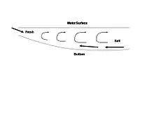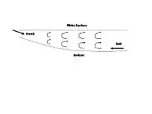 Inverse estuaries occur in dry climates where evaporation greatly exceeds the inflow of freshwater. A salinity maximum zone is formed, and both riverine and oceanic water flow close to the surface towards this zone.[7] This water is pushed downward and spreads along the bottom in both the seaward and landward direction. The maximum salinity can reach extremely high values and the residence time can be several months. In these systems, the salinity maximum zone acts like a plug, inhibiting the mixing of estuarine and oceanic waters so that freshwater does not reach the ocean. The high salinity water sinks seaward and exits the estuary.[8][9]