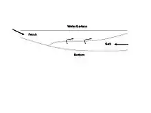 These estuaries are characterized by a sharp density interface between the upper layer of freshwater and the bottom layer of saline water. River water dominates in this system, and tidal effects have a small role in the circulation patterns. The freshwater floats on top of the seawater and gradually thins as it moves seaward. The denser seawater moves along the bottom up the estuary forming a wedge shaped layer and becoming thinner as it moves landward. As a velocity difference develops between the two layers, shear forces generate internal waves at the interface, mixing the seawater upward with the freshwater.[6] An example is the Mississippi estuary.