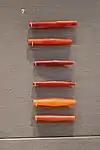 A rare etched carnelian bead found in Egypt, thought to have been imported from the Indus Valley Civilization through Mesopotamia. Late Middle Kingdom. London, Petrie Museum of Egyptian Archaeology, ref. UC30334.[48][49]