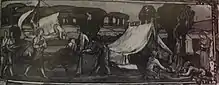 On the extreme left the boat comes to her muddy mornings and I am seen unshipping the rudder, then Harold (Hobson) is seen grumbling on his way to fetch wood, then the big tent and Ka and you cooking, then Dudley (Ward) and the Financial Times and Rupert and all.[9]