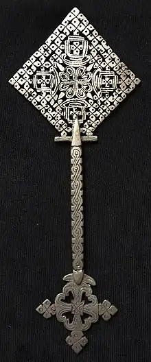 Ethiopian crosses, Abyssinian crosses, or Ethiopian-Eritrean crosses are a grouping of Christian cross variants that are symbols of Christianity in Ethiopia, Eritrea, and among Ethiopians and Eritreans. Their elaborate, stylized design is markedly distinct from other Christian cross variants .[1][2] Ethiopian crosses are almost always made from elaborate latticework, the intertwined lattice represents everlasting life.[3] No two crosses are exactly identical in style, the artisans who make them being allowed the freedom to exercise a measure of individual taste and creativity in their choice of shape and pattern. Crosses may be of the processional type with a socket at the base so they may be mounted on a staff and carried in church ceremonies or hand-held blessing crosses used by priests in benedictions.[4]