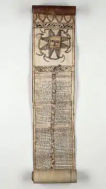 The John Rylands Library owns 45 items on parchment and paper, dating from the 1600s and later. The majority (31 items) came to the library from the Crawford collection, purchased in 1901.[23] In addition to a copy of the Fetha Nagast (Ge'ez: ፍትሐ ነገሥት) (Ethiopian MS 13) and a deed of Dawit III (Ethiopian MS 28), the collection includes a number of magic scrolls (Ethiopian MSS 29-34).