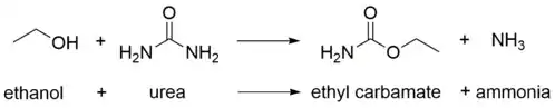 It has been shown that ethyl carbamate forms from the reaction of ethanol with urea: