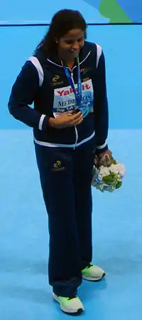 At the 2016 Summer Olympics, she went to the Women's 50 metre freestyle final, finishing 8th.[43] She broke the South American record with a time of 24.45 in semifinals.[44] She also competed in the Women's 100 metre freestyle, finishing 16th in the semifinals;[45] in the Women's 100 metre backstroke, finishing 25th;[46] and in the Women's 4 × 100 metre freestyle relay, finishing 11th.[47]