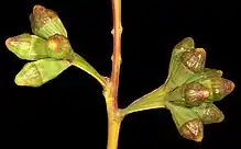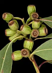The mallee typically grows to a height of 1.5 to 7 metres (5 to 23 ft) and has smooth bark. It blooms between August and March producing white to creamy yellow flowers.[4] It has a lignotuber and can form multiple stems. The bark is smooth and a grey colour with loose strips of rough bark accumulating toward the base. It remains smooth but becomes a pale grey, grey-brown, white or pinkish to coppery colour with ribbons on the upper branches. The thick, concolorous, glossy, green adult leaves have an alternate arrangement. The leaf blade has a lanceolate to broadly lanceolate to ovate-elliptic shape and is 5 to 14 centimetres (2.0 to 5.5 in) in length and 1.7 to 5 cm (0.67 to 1.97 in) with the base tapering evenly to petiole. Petioles are 1 to 3 cm (0.39 to 1.18 in) in length.[7] Each axillary inflorescence is unbranched with flattened peduncles. The fruit is also pedicellate and has a cylindrical, hemispherical or urceolate shape. They are 1 to 2.5 cm (0.39 to 0.98 in) wide with coarse longitudinal ribbing and a descending disc descending and three to four enclosed valves. The fruit contains blackish grey seeds that are 2 to 4.5 mm (0.08 to 0.18 in) in length with a flattened-pyramidal or cuboid shape.[7]