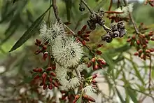 The flowers are borne in groups of between seven and thirteen in leaf axils on a peduncle 3–15 mm (0.1–0.6 in) long, the individual flowers on a pedicel 1–2 mm (0.04–0.08 in) long. Mature buds are oblong to spindle-shaped, 8–11 mm (0.3–0.4 in) long and 2–4 mm (0.08–0.2 in) wide with a conical to horn-shaped operculum. Flowering mainly occurs from June to August and the flowers are white. The fruit that follows is a woody, hemispherical to a shortened sphere 3 to 4 mm (0.12 to 0.16 in) long and 4 to 5 mm (0.16 to 0.20 in) in diameter.[4][5][6]