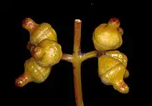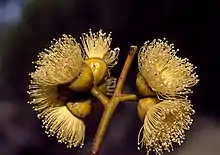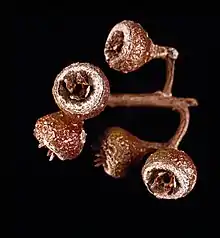 The flowers are borne in groups of seven in leaf axils on an unbranched peduncle 10–20 mm (0.39–0.79 in) long, the individual buds sessile or on a pedicel 5–11 mm (0.20–0.43 in) long. Mature buds are more or less spherical, 19–25 mm (0.75–0.98 in) long and 9–11 mm (0.4–0.4 in) wide with a beaked operculum, the beak less obvious as the bud develops. Flowering mainly occurs from August to October and the flowers are pale yellow. The fruit is a woody hemispherical or shortened spherical capsule 7–11 mm (0.28–0.43 in) long and 10–14 mm (0.4–0.6 in) wide.[3][4][5][6]