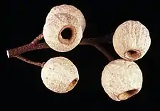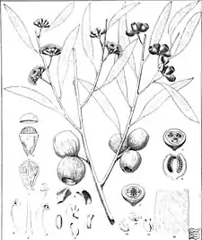 Eucalyptus buprestium, also known as the apple mallee[3] or ball-fruited mallee,[4] is a small mallee that is endemic to an area along the south coast of Western Australia. It has smooth bark, narrow lance-shaped adult leaves, flower buds arranged in groups of between nine and fifteen, white flowers and almost spherical fruit with a small opening.