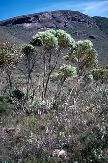 Apple mallee is found on coastal and near-coastal sandplains and ridge tops along the south coast in the Great Southern region of Western Australia between Albany in the west, Mount Barker in the north and Jerramungup in the east where it grows in gravelly sandy-clay soils.[3][4][5]