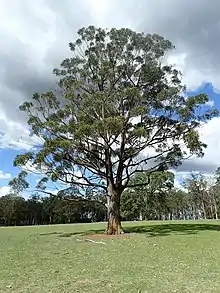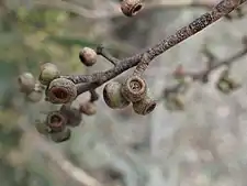 This eucalypt is similar to E. globoidea but has smaller buds and fruit, and the fruit has a narrower disc. It is also similar to E. caliginosa which has the valves of the fruit extended beyond the rim.[6]