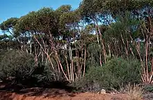 Eucalyptus cerasiformis, commonly known as the cherry-fruited mallee,[2] is a mallee that is endemic to a small area of Western Australia. It has smooth, pale grey, sometimes powdery bark, lance-shaped adult leaves, flower buds in groups of seven, pale yellow or whitish flowers and cylindrical or bell-shaped fruit.
