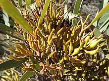 Eucalyptus clivicola, commonly known as green mallet,[3] is a species of eucalypt that is endemic to Western Australia. It has smooth bark, linear to lance-shaped adult leaves, flower buds in groups of between nine and thirteen, pale yellow flowers and barrel-shaped, conical or cylindrical fruit.