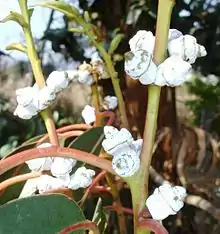 Eucalyptus cordata, commonly known as the heart-leaved silver gum[3] is a shrub to medium-sized tree that is endemic to Tasmania. It has smooth bark throughout, mostly only juvenile, more or less heart-shaped, glaucous leaves, glaucous flower buds arranged in groups of three, white flowers and cylindrical or hemispherical fruit.
