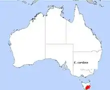 Heart-leaved silver gum has a restricted distribution in the south-east of Tasmania, growing at intermediate altitudes such as on the foothills of Mount Wellington, on the Snug Plains and around Port Arthur and Moogara. The tree makes an attractive ornamental with its large, glaucous juvenile leaves, which often persist in the crown.[11] Subspecies cordata mainly occurs south from Triabunna and is found on Bruny and Maria Islands. Subspecies quadrangulosa is centred on the Wellington Range but is most prolific on the Snug Plains.[5]