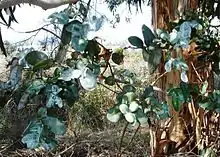 Eucalyptus cordata is a scraggy shrub or tree that typically grows to a height of between 3 and 25 m (9.8 and 82.0 ft) and forms a lignotuber. It has smooth greenish yellow to brown or grey bark throughout and has glaucous branchlets. Larger trees sometimes have rough bark on the lower part of the trunk. Its crown is mostly composed of juvenile leaves and adult leaves are usually only found at the top of the tallest trees. The leaves of young plants, coppice regrowth and mature plants have sessile leaves arranged in opposite pairs, the leaves egg-shaped to almost round, 30–55 mm (1.2–2.2 in) long and 20–55 mm (0.79–2.17 in) wide with wavy edges. Adult leaves, only present in the crown of tall trees, are arranged alternately, lance-shaped, 75–130 mm (3.0–5.1 in) long and 20–38 mm (0.79–1.50 in) wide on a flattened petiole 15–20 mm (0.59–0.79 in) long. The flower buds are arranged in groups of three in leaf axils on a peduncle 2–9 mm (0.079–0.354 in) long, the individual buds sessile or on a very short pedicel. Mature buds are oval to club-shaped, green or glaucous, 9–13 mm (0.35–0.51 in) long and 7–9 mm (0.28–0.35 in) wide with a rounded, flattened or beaked operculum. Flowering has been observed in most months, with peaks between May and June, September and November, and the flowers are white. The fruit is a woody cup-shaped, cylindrical or hemispherical capsule 7–13 mm (0.28–0.51 in) long and 9–15 mm (0.35–0.59 in) wide and sessile or on a very short pedicel.[3][4][5]