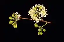 The flower buds are arranged in groups of seven, nine or eleven in leaf axils on an unbranched peduncle 8–22 mm (0.31–0.87 in) long, the individual buds on a pedicel 3–6 mm (0.12–0.24 in) long. Mature buds are oval to pear-shaped, 4–7 mm (0.16–0.28 in) long and 3–4 mm (0.12–0.16 in) wide with a conical to rounded or beaked operculum. Flowering occurs from February to April and the flowers are white. The fruit is a woody cup-shaped to bell-shaped capsule 4–6 mm (0.16–0.24 in) long and 5–7 mm (0.20–0.28 in) wide with the valves at rim level or slightly beyond.[2][3][4][5][7]
