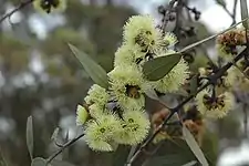 Eucalyptus desmondensis is a slender, willowy mallee that typically grows to a height of 1–4.5 m (3 ft 3 in – 14 ft 9 in) and forms a lignotuber. It has smooth whitish or pale brown bark, sometimes a drooping crown, and glaucous branchlets. Young plants and coppice regrowth have stems that are more or less square in cross-section and egg-shaped leaves 55–110 mm (2.2–4.3 in) long and 20–50 mm (0.79–1.97 in) wide. Adult leaves are arranged alternately, thick, the same glossy grey-green on both sides. They are lance-shaped, 55–110 mm (2.2–4.3 in) long and 15–25 mm (0.59–0.98 in) wide on a petiole 12–20 mm (0.47–0.79 in) long. The flower buds are arranged in leaf axils in groups of between nine and nineteen on a flattened, glaucous, unbranched peduncle 7–20 mm (0.28–0.79 in) long. The individual buds are sessile or borne on a pedicel up to 3 mm (0.12 in) long. Mature buds are oval, non-glaucous, 7–12 mm (0.28–0.47 in) long and 4–6 mm (0.16–0.24 in) wide with a conical operculum that is slightly longer than the floral cup. Flowering mainly occurs between May and November and the flowers are cream-coloured to pale yellow. The fruit is a woody cup-shaped to short barrel-shaped capsule 5–10 mm (0.20–0.39 in) long and 6–9 mm (0.24–0.35 in) wide.[2][3][4][5]