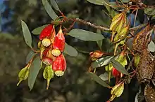 Eucalyptus dolichorhyncha is a mallet that typically grows to a height of 1–6 m (3 ft 3 in – 19 ft 8 in) but does not form a lignotuber. It has smooth, pale grey over pale orange to pale brown bark. Young plants and coppice regrowth have leaves arranged alternately and egg-shaped to lance-shaped, 30–100 mm (1.2–3.9 in) long and 20–60 mm (0.79–2.36 in) wide and petiolate. Adult leaves are lance-shaped to oblong, 45–90 mm (1.8–3.5 in) long and 10–27 mm (0.39–1.06 in) wide on a petiole 8–16 mm (0.31–0.63 in) wide. The flower buds hang singly in leaf axils on a peduncle 20–42 mm (0.79–1.65 in) long, the pedicel 8–15 mm (0.31–0.59 in) long. Mature buds are red, oblong and square in cross section with a wing on each corner, 32–55 mm (1.3–2.2 in) long and 10–18 mm (0.39–0.71 in) wide. Flowering occurs between January and May and the flowers are yellow. The fruit is a woody capsule that is a similar shape to the mature buds, 29–40 mm (1.1–1.6 in) long and 13–30 mm (0.51–1.18 in) wide with the valves enclosed below the rim.[3][4]