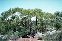 - Eucalyptus effusa subsp. exsul,[9] commonly known as desert gimlet,[10] has a rounded operculum and slightly glaucous branchlets.[7]