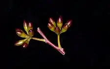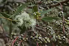 E. effusa is one of the nine true gimlet species that have buds in groups of seven, and the only gimlet that is a mallee. The other true gimlets are E. campaspe, E. creta, E. diptera, E. jimberlanica, E. ravida, E. terebra, E. salubris and E. tortilis.[11][12]