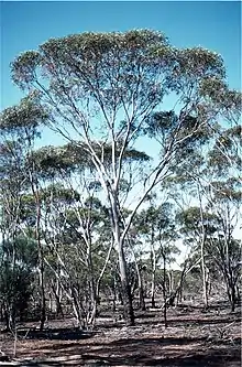 Eucalyptus fraseri, commonly known as Balladonia gum,[2] is a species of tree or mallet that is endemic to Western Australia. It has smooth white to greyish bark, lance-shaped or curved adult leaves, flower buds in groups of seven or nine, white flowers and cup-shaped, conical or hemispherical fruit.