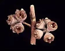 Eucalyptus malacoxylon is a tree that typically grows to a height of 15–20 m (49–66 ft) and forms a lignotuber. It has rough, gray, fibrous or flaky bark on the trunk and larger branches, smooth dull grey bark on branches thinner than 50–80 mm (2.0–3.1 in). Young plants and coppice regrowth have heart-shaped or egg-shaped leaves that are 40–70 mm (1.6–2.8 in) long and 30–70 mm (1.2–2.8 in) wide. Adult leaves are lance-shaped to curved, the same glossy green on both sides, 90–300 mm (3.5–11.8 in) long and 20–40 mm (0.79–1.57 in) wide, tapering to a petiole 20–50 mm (0.79–1.97 in) long. The flower buds are arranged in leaf axils on an unbranched peduncle 10–17 mm (0.39–0.67 in) long, the individual buds on pedicels 2–6 mm (0.079–0.236 in) long. Mature buds are glaucous, diamond-shaped, about 6 mm (0.24 in) long and 5 mm (0.20 in) wide with a conical operculum. The flowers are white and the fruit is a woody, cup-shaped, conical or hemispherical capsule 4–7 mm (0.16–0.28 in) long and 7–10 mm (0.28–0.39 in) wide with the valves near the level of the rim or protruding above it.[2][3][4]