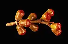 Eucalyptus merrickiae, commonly known as goblet mallee,[3] is a species of mallee that is endemic to a small area on the south coast of Western Australia. It has rough, flaky bark on part or all of the trunk, sometimes on the base of the larger branches, linear adult leaves, flower buds in groups of three, creamy white flowers and cylindrical fruit.
