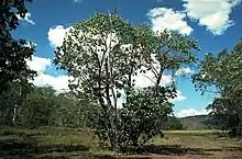 Eucalyptus neglecta, commonly known as Omeo gum,[2] is a species of small tree that is endemic to a small area of Victoria, Australia. Older plants have rough, fibrous bark on the trunk, otherwise smooth grey to brownish bark, a crown of mostly lance-shaped, egg-shaped or oblong leaves arranged in opposite pairs, flower buds in groups of between seven and fifteen, white flowers and cup-shaped or conical fruit.