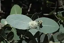 Eucalyptus neglecta is a tree, sometimes a mallee that typically grows to a height of 6–7 m (20–23 ft) and forms a lignotuber. It has smooth grey to brownish bark, but older specimens often have fibrous grey to brown bark on the trunk. The crown of the tree is mostly composed of sessile, juvenile leaves that are arranged in opposite pairs, with some intermediate and adult leaves. Juvenile leaves are greyish green, broadly elliptic to almost round, up to 110 mm (4.3 in) long and 70 mm (2.8 in) wide. Adult leaves are lance-shaped, the same shade of green on both sides, 80–150 mm (3.1–5.9 in) long and 25–35 mm (0.98–1.38 in) wide on a petiole up to 23 mm (0.91 in) long. The flower buds are arranged in leaf axils in groups of between seven and fifteen on an unbranched peduncle up to 5 mm (0.20 in) long, the individual buds sessile. Mature buds are oval, 3–6 mm (0.12–0.24 in) long and 3–5 mm (0.12–0.20 in) wide with a conical to rounded operculum. Flowering occurs between November and February and the flowers are white. The fruit is a woody, cup-shaped or conical capsule 3–4 mm (0.12–0.16 in) long and 4–7 mm (0.16–0.28 in) wide with the valves near rim level.[2][3][4]