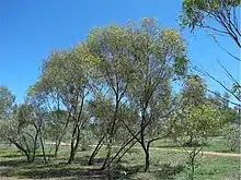Eucalyptus normantonensis, commonly known as Normanton box,[2] is a species of mallee, rarely a small tree, that is endemic to northern Australia. It has rough, fibrous or flaky bark on some or all of the stems, lance-shaped to curved adult leaves, flower buds in groups of between seven and eleven, white flowers and cylindrical, barrel-shaped or shortened spherical fruit.