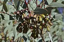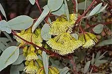 Eucalyptus pimpiniana, commonly known as the pimpin mallee,[2] is a species of shrubby mallee that is endemic to the Great Victoria Desert of South Australia and Western Australia. It has smooth, mottled bark, lance-shaped adult leaves, flower buds in group of between seven and nineteen, yellow flowers and cylindrical to barrel-shaped fruit.
