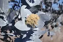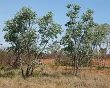 Eucalyptus pruinosa, commonly known as silver box, silver leaf box, apple box or smoke tree,[2] is a species of tree or a mallee that is endemic to northern Australia. The Jaminjung peoples know the tree as yarrirra or jarnbiny, the Jaru as wararn and the Wagiman as wararn.[2] It has rough, fibrous to flaky bark on the trunk and branches, a crown composed of juvenile, glaucous, heart-shaped to broadly elliptical leaves arranged in opposite pairs, flower buds arranged in groups of seven on the ends of branches, creamy white to pale yellow flowers and cylindrical to conical fruit.