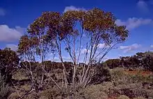 The stiff-leaved mallee is found in heath and shrubland between the lower Murchidon River, Grass Patch and the western edge of the Great Victoria Desert, growing in yellow or red sandy soils.[2]