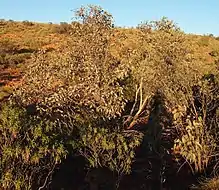 Eucalyptus sessilis grows in open shrubland on stony slopes. It is found in the central Northern Territory in an area centred around Alice Springs with a scattered distribution that extends west over the Western Australian border into the Goldfields-Esperance region. It is most often found on rocky ranges particularly the MacDonnell Ranges and Central Ranges in the Northern Territory and the Rawlinson Ranges and Walter James Range in Western Australia. It is also scattered through the Finke River basin, Great Sandy Desert and Burt Plains.[2][5][4]